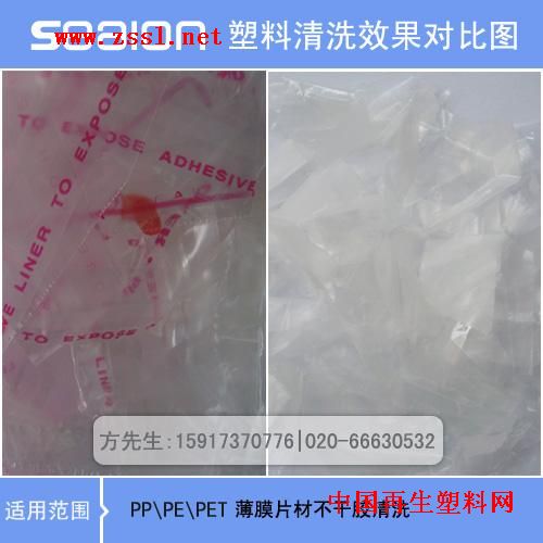 供应:PP/PE/PET薄膜脱墨脱胶剂/塑料薄膜类去字去胶清洗剂/废旧薄膜油墨脱除剂产品特性: 废旧薄膜油墨不干胶清洗剂海离子303是针对国内外PP/PE表面的油墨脱除而研制的。在无需加温的条件下,能快速有效地洗净表面及环境污染的各种脏物,洗后切粒颜色较白,附加值高,是现行从PP/PE薄膜回收处理厂家增加利润的理想用品。 产品优势: ● 不含磷及亚硝酸盐等有害物质 ● 无需加温,节约能耗,降底加工成本 ● 清洗速度快,一般为0.5~1小时,有利于大批量生产 ● 成本更低,处理每吨的药水仅需 150元左右 ● 工艺简单,对整袋或破碎清洗工艺均通用 ● 设备投入少,对新开回收处理厂更加有利 ● 洗净力大,清净度高,能大副提高产品的附加值 ● 无泡及无害设计,废水排放不污染环境 适应范围:各种PP/PE/PET表面油墨、不干胶的清洗脱除。 使用方法:将PP/PE/PET浸入按比例配兑好的海离子303清洗液中,常温浸泡1小时左右即取出,脱水后经破碎清洗机洗净即可;清洗液面下降部分,补加新液即可。 注意事项: 1.本产品是海离子制品,请存放于阴凉避光处 2.不慎溅入眼睛,请用大量清水冲洗 3.长期作业请带胶手套 4.废水需经处理方能排放 产品其他名称:PP/PE/PET薄膜除墨除胶剂、PP/PE/PET薄膜脱墨脱胶剂、PP/PE/PET薄膜表面油墨脱除剂、PP/PE/PET薄膜去字去胶剂、废旧PP/PE/PET薄膜脱色剂、PP/PE/PET薄膜除色剂、PP/PE/PET薄膜再生处理剂、PP/PE/PET薄膜脱胶除污渍清洗剂、PP/PE/PET薄膜不干胶脱除剂,塑料PP/PE/PET薄膜类清洗剂 其它废旧塑料脱漆产品:PC光盘脱漆脱色剂,PP编织袋油墨清洗剂常温清洗、ABS烤漆脱除剂、PS脱漆剂、其它PET,PP,PE,PVC,PO等脱漆剂,不干胶(粘合胶)清洗剂、酸奶瓶常温除油墨清洗剂、奶瓶脱漆剂,眼镜片脱色剂,烤漆脱除剂等。提供建厂方案,工艺设计,工艺设备制造,环境保护评价等。 另售【加温型】废旧塑料薄膜脱油墨清洗剂 备注:我司专业从事塑料再生海离子塑料清洗剂技术开发、生产以及配套的海离子清洗工艺设备制造,并提供废旧塑料代加工清洗服务。 联系人:方先生 电话:020-66630532 15917370776,13189010975 QQ:12726247 EMAIL:fx820123@163.com